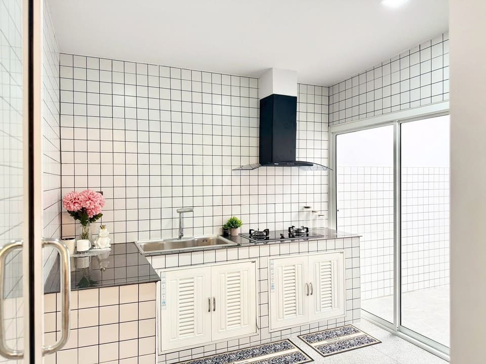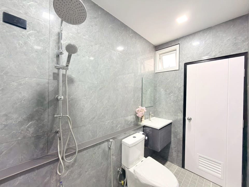 The interior features a modern and minimalist style, with a connected living and dining area in a practical layout. The kitchen is designed with an extended countertop to provide additional workspace and storage, and all sanitary ware has been newly installed. The bedrooms are moderately sized, suitable for a small family or a couple. The house comes furnished, with water and electricity meters already installed, allowing immediate move-in or rental without major additional renovation.