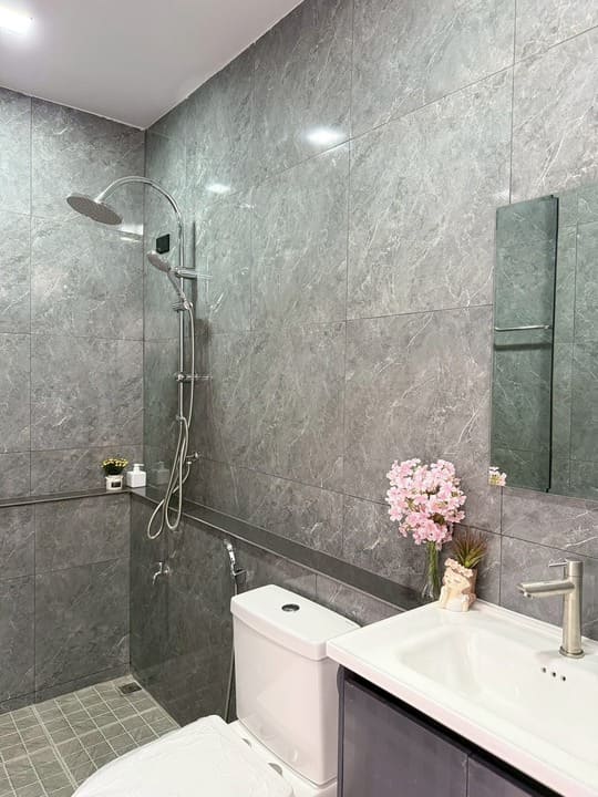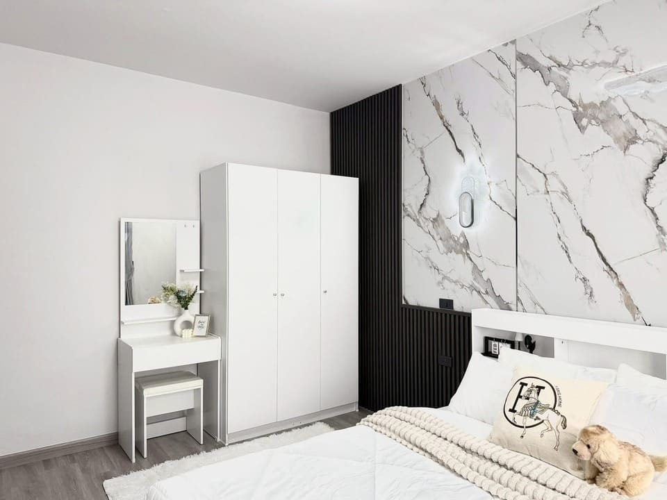 室内为现代简约装修风格,客厅与餐厅空间相连,整体布局紧凑实用。厨房采用延伸式台面设计,增加了操作与储物空间,卫浴设备为全新更换。卧室面积适中,适合小家庭或两人居住。房屋包含基本家具配置,水表与电表已安装到位,无需额外进行大规模装修,可直接入住或作为出租使用。
