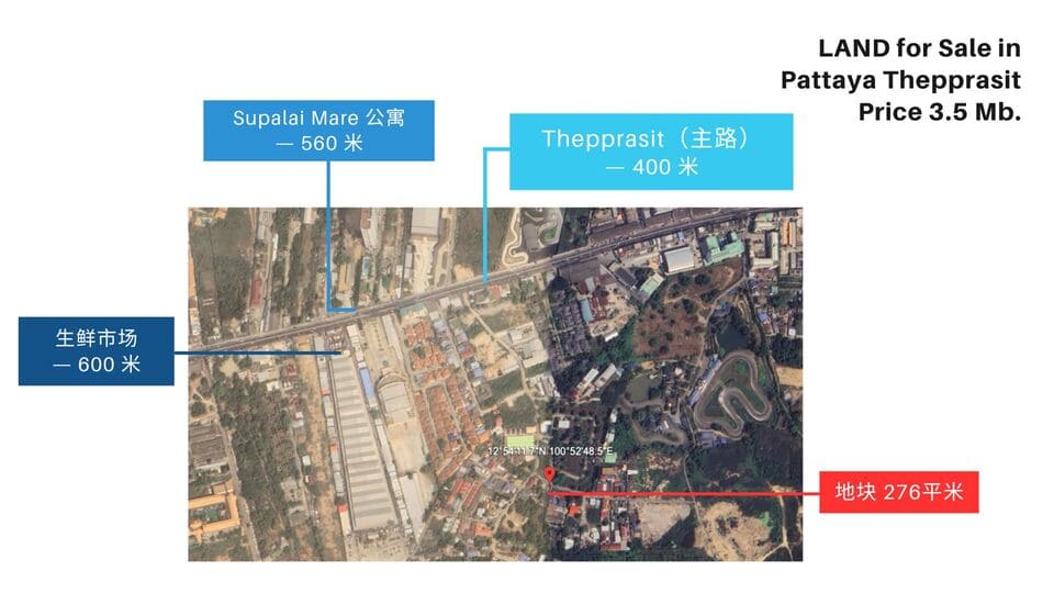 该地块位于芭提雅南,距离 Thapprasit 主路约400米,靠近大型生鲜市场(约600米)。周边配套齐全,邻近苏帕莱公寓(Supalai Mare Pattaya)、芭提雅最大夜市——周末夜市(Thapprasit Night Market)等。距离 Dongtan 海滩仅约2公里,地理位置优越。