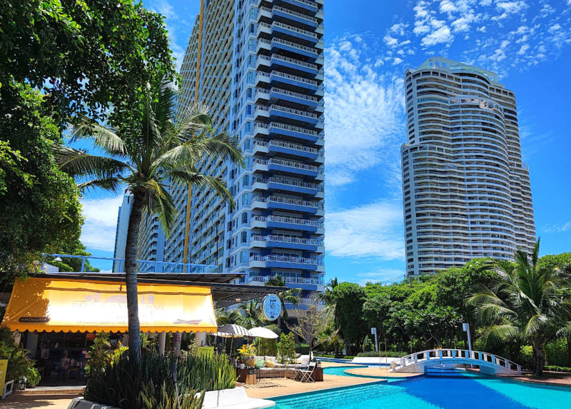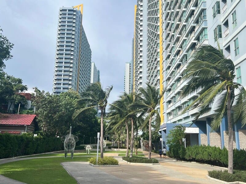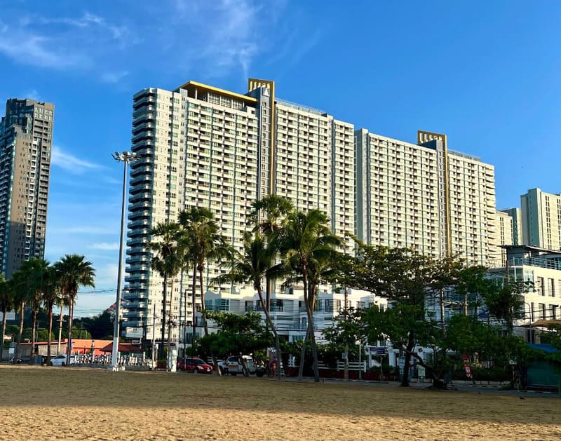 芭提雅中天海滨路旁,穿过海滨路就是海滩,通双条车,海滨路有便利店、超市、夜市、各类餐饮店,公寓里面就有 7-11 便利店、ATM 、净水机、洗衣房等, 生活十分方便。