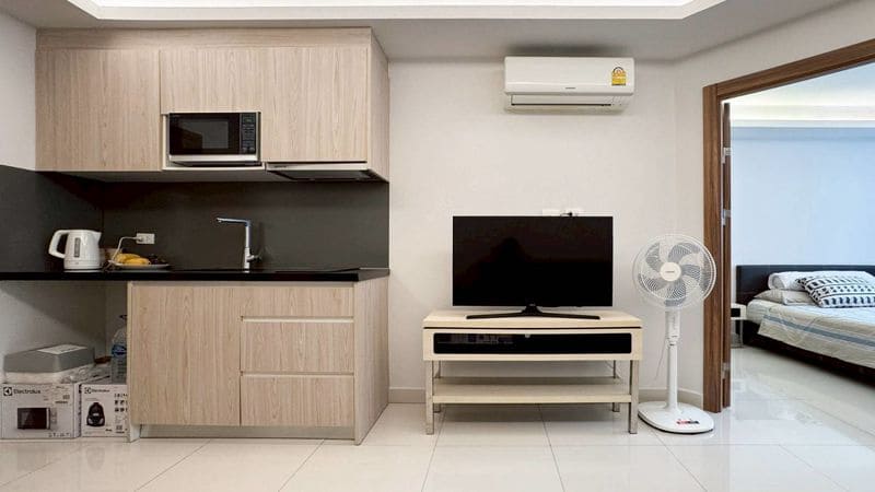 芭提雅中天,水系公寓,小区门口有 7-11 和 Tops 两个便利店,距离海滩和移民局1公里。附近有生鲜市场、体育馆、公园等。