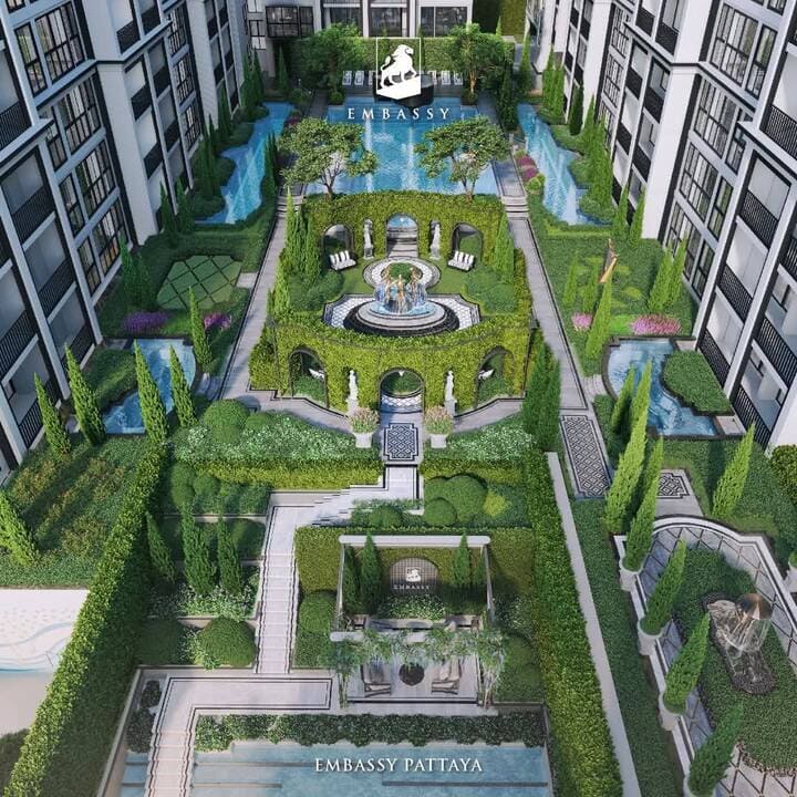 大使馆(Embassy Pattaya)公寓项目,楼高 8 层,共有 474 个住宅单元,计划于 2027 年 6 月竣工。旁边是 “亚特兰蒂斯 ” 和 “亚马逊“ 水系公寓 ,紧邻环境优美的 Public 城市公园。