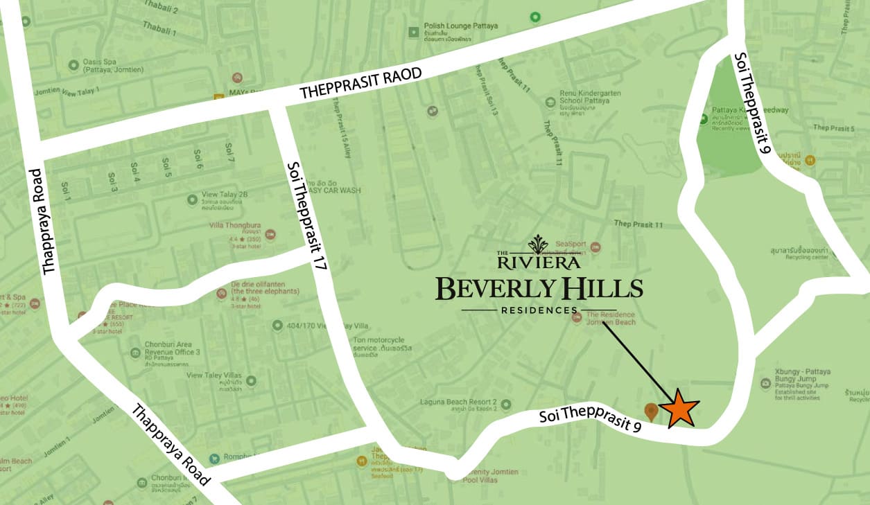 The Riviera Beverly Hills is located in Jomtien, Pattaya, with convenient transportation and easy access to major attractions in Pattaya. It is only a few minutes away from the beach, shopping malls, and has quick access to international schools, hospitals, parks and world-class entertainment venues. It is very suitable for self-occupation or rental investment.
