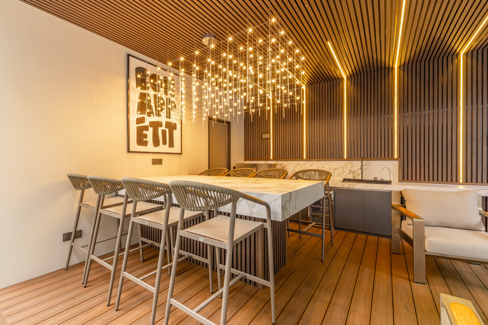 Key Features: 主要特点: ✔ Grand entrance with smart stainless steel doors ✔ 宏伟的入口配有智能不锈钢门 ✔ Living/dining area opening to pool terrace ✔ 起居/用餐区通向泳池露台 ✔ Outdoor kitchen with BBQ & dining space ✔ 带烧烤和用餐空间的户外厨房 ✔ Maids’ quarters with attached bathroom ✔ 女佣宿舍,配有浴室