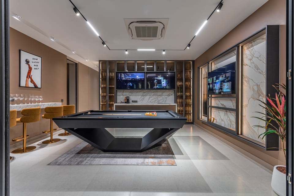 Entertainment room with bar & pool table