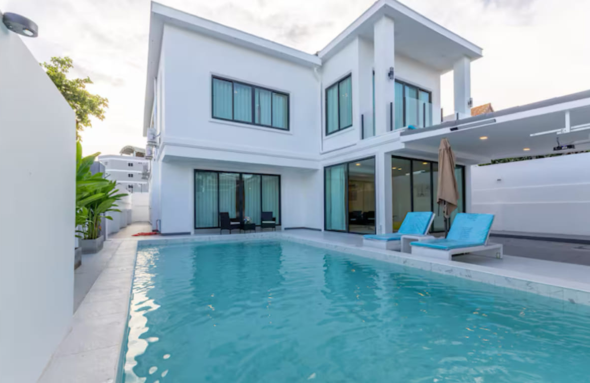 This villa is located in South Pattaya, close to Walking Street. The land area is 396 square meters, with a built-up area of approximately 400 square meters. It features six bedrooms and seven bathrooms, a European-style kitchen, and is fully furnished with all appliances. Parking is available for one or two cars. The pool measures 4.5 x 10 meters, with a depth of 1.1 to 1.5 meters.