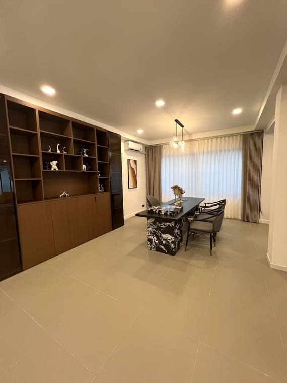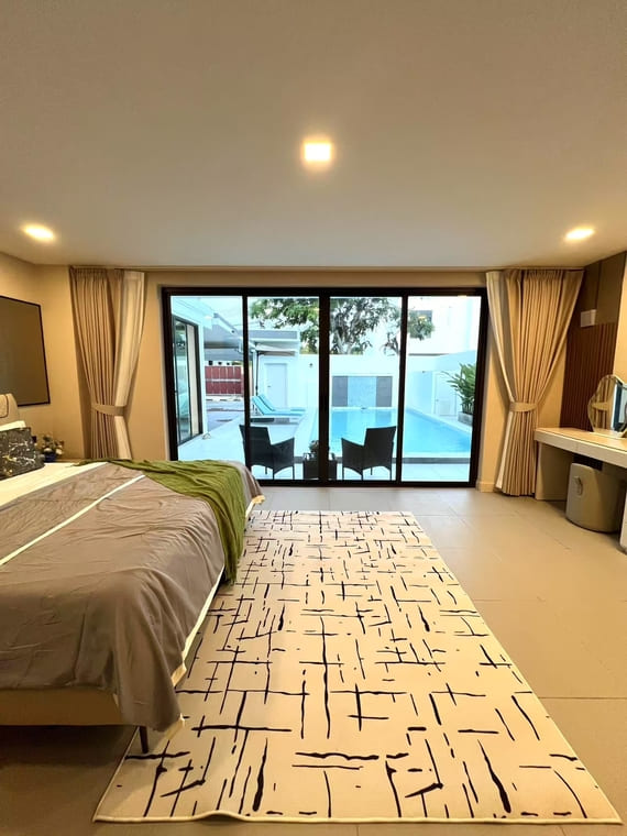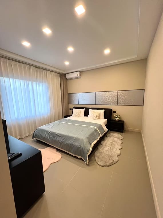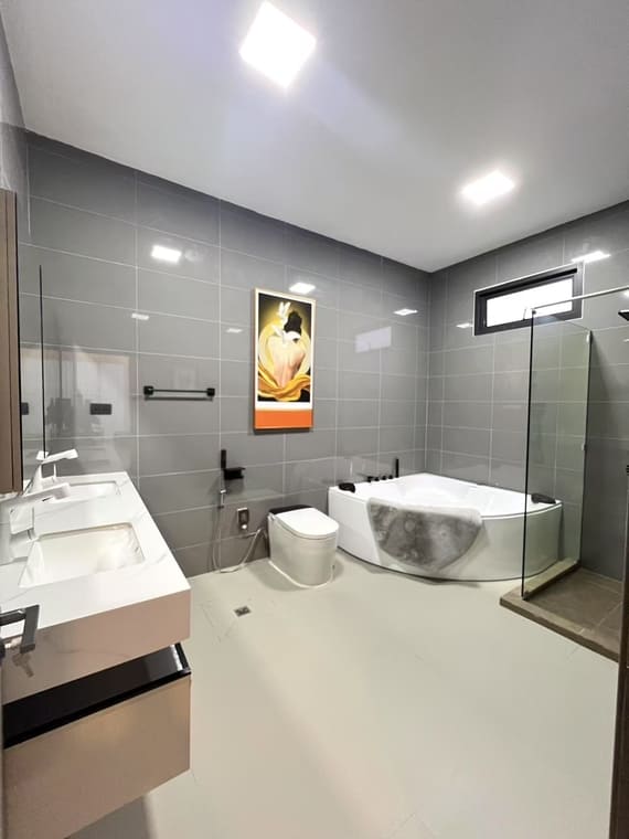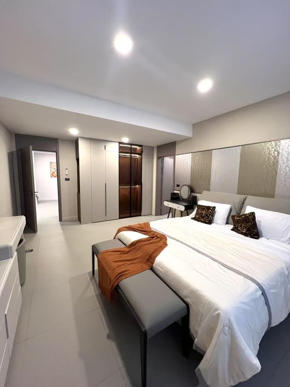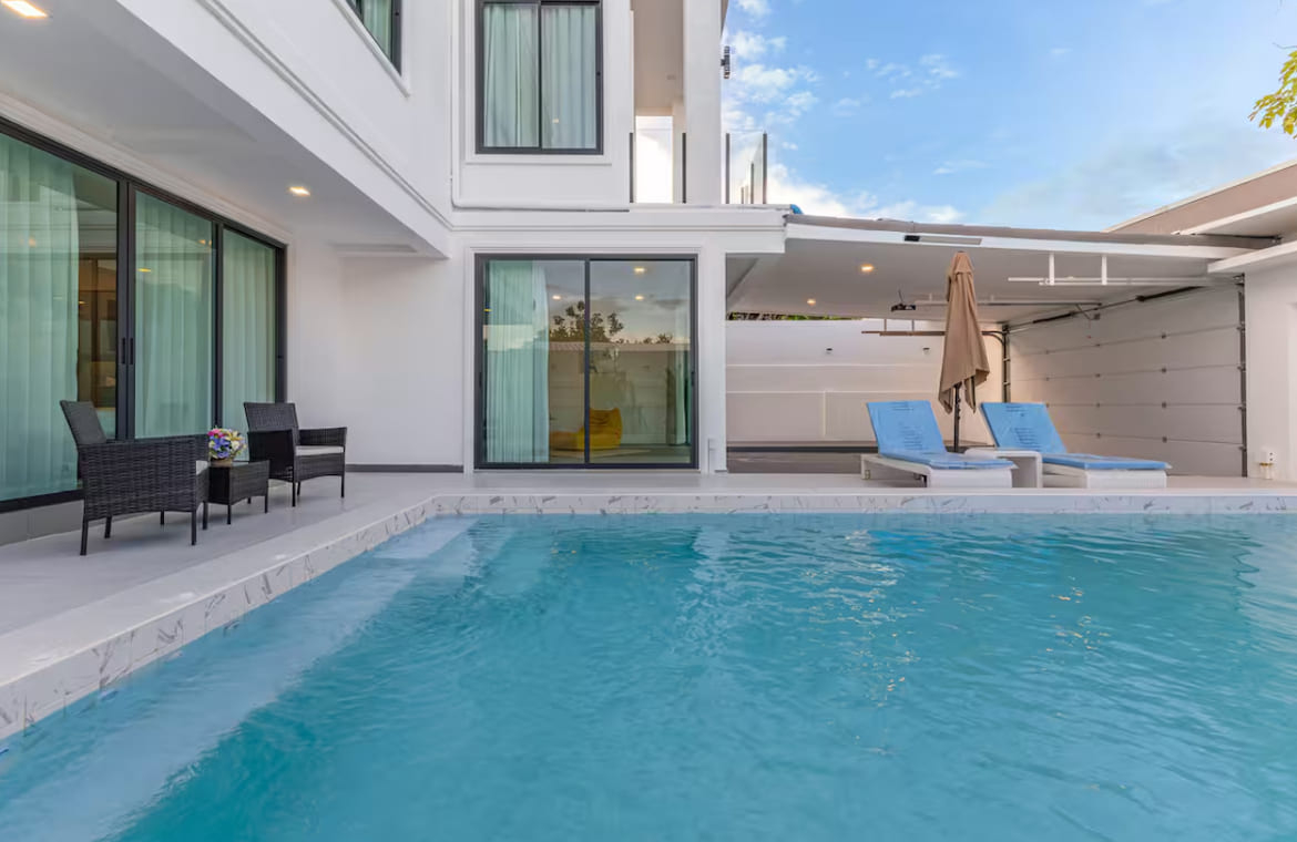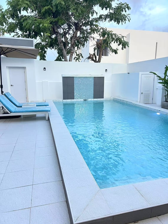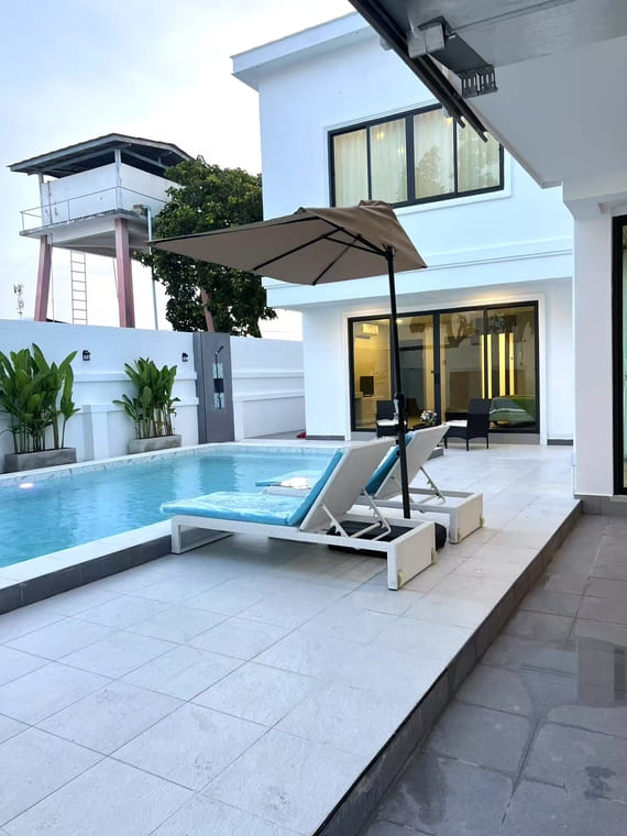 This villa is located in South Pattaya, close to Walking Street. The land area is 396 square meters, with a built-up area of approximately 400 square meters. It features six bedrooms and seven bathrooms, a European-style kitchen, and is fully furnished with all appliances. Parking is available for one or two cars. The pool measures 4.5 x 10 meters, with a depth of 1.1 to 1.5 meters.