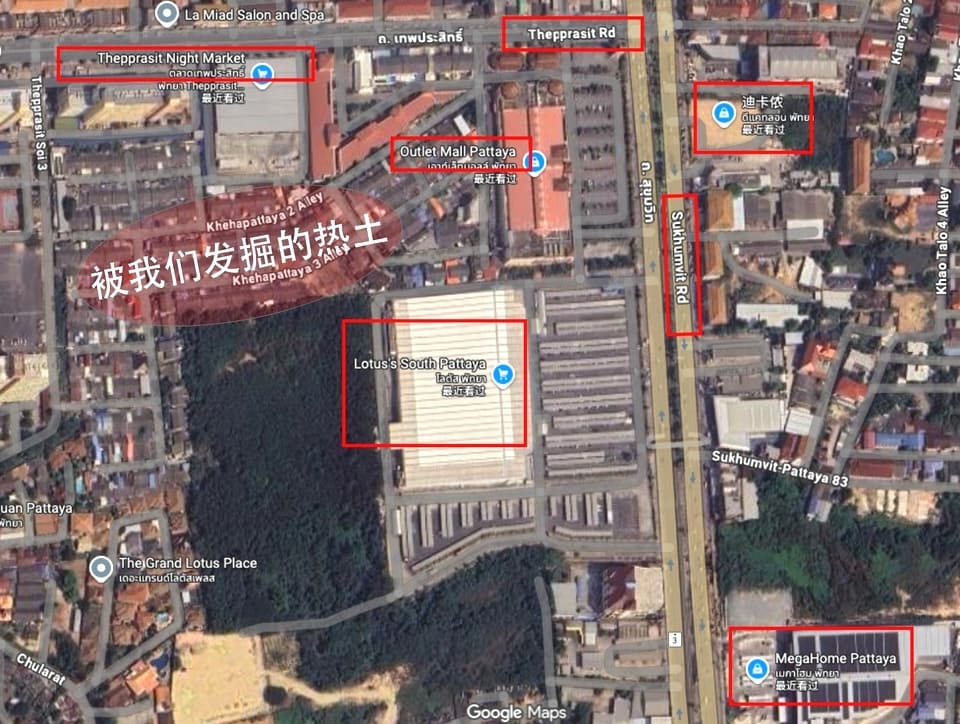 该地块坐落于芭提雅南核心地段,紧邻素坤逸大道,交通便捷,区位优势显著。周边商业氛围浓厚,毗邻奥特莱斯购物中心(Outlet Mall Pattaya)与知名的周末夜市(Thapprasit Night Market),人流汇聚。配套设施齐全,周边环绕莲花大型超市(Lotus’s)、Big C 超市、迪卡侬(Decathlon)及 MegaHome 家居建材广场,生活便利,商机无限。