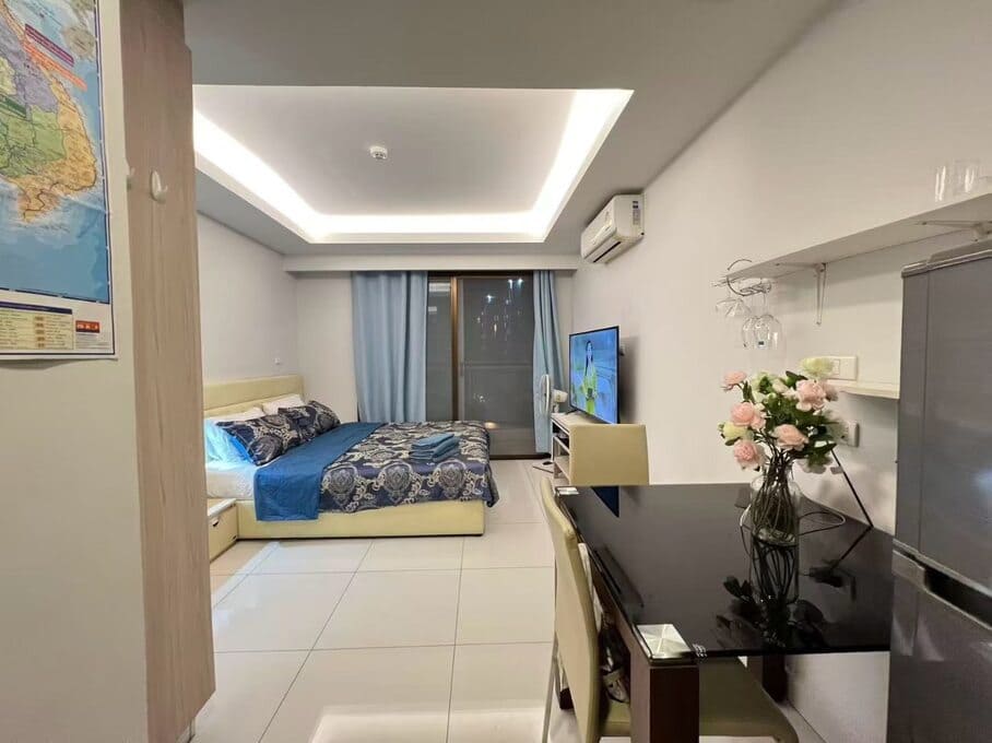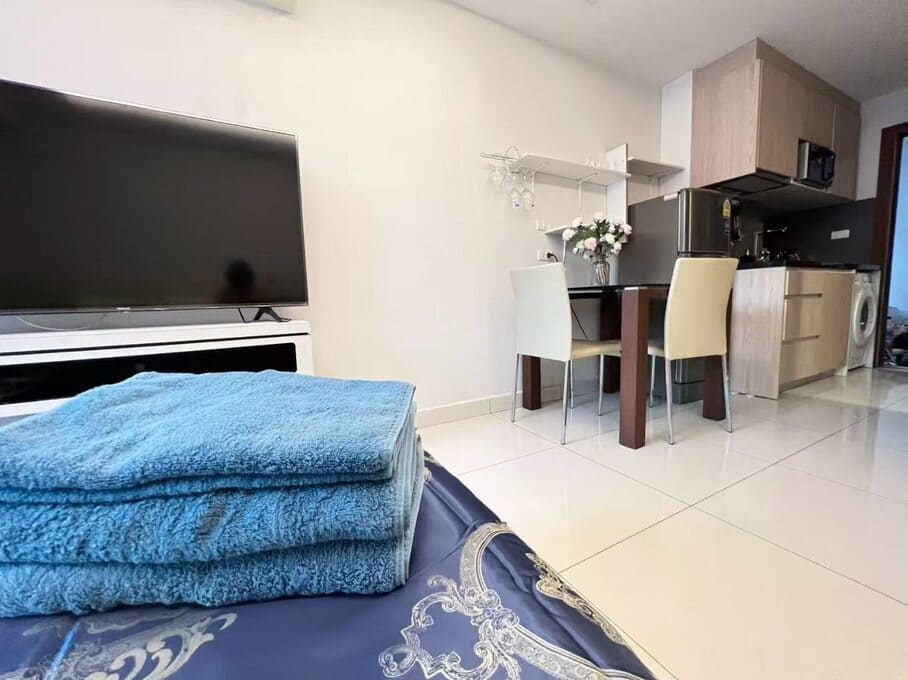 芭提雅中天,水系公寓,小区门口有 7-11 和 Tops 两个便利店,距离海滩和移民局1公里。附近有生鲜市场、体育馆、公园等。
