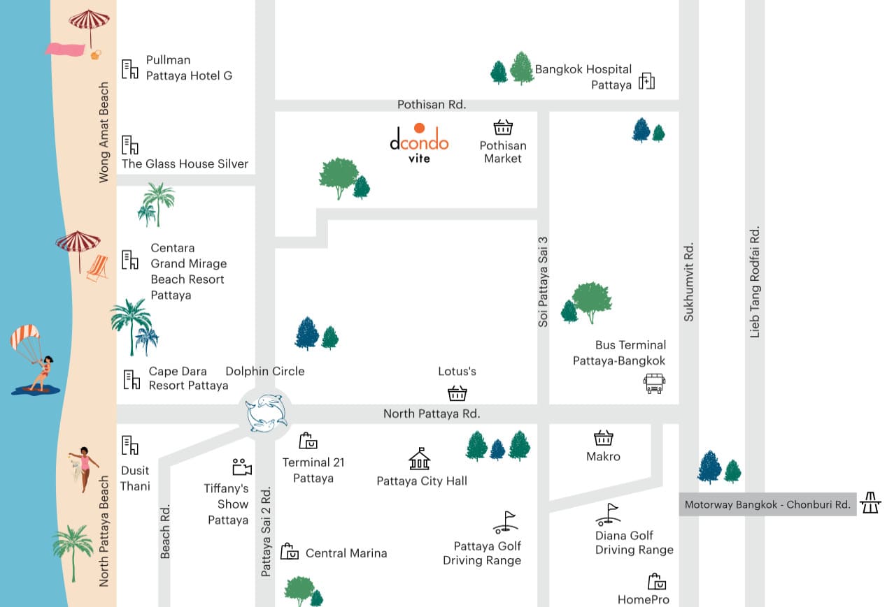 With easy access to Sukhumvit Road, residents can travel conveniently within Pattaya and to Bangkok. Pattaya Beach is also just a short drive away, offering both city convenience and seaside lifestyle.