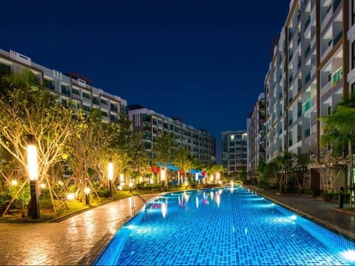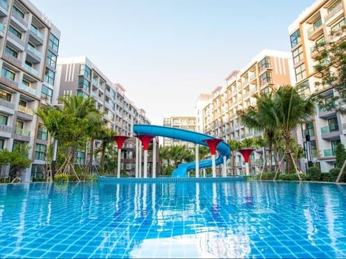 项目位于芭提雅中天,水系公寓,出公寓就有7-11和全家超市,距离中天海滩和移民局1公里。紧邻水系公寓 Laguna Beach Resort 2,周围有夜市和市政公园。