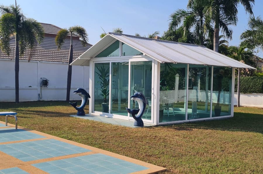 主屋内部设有 3 间卧室及 4 间卫生间,配备开放式厨房与餐厅空间,客厅宽敞明亮,并设有独立书房,满足日常生活、休闲及办公需求。副屋为独立区域,设有 3 间卧室及 3 间卫生间,并配置靠近泳池的起居休闲空间,适合作为员工房、客房或家庭成员独立居住区域,互不干扰,私密性良好。