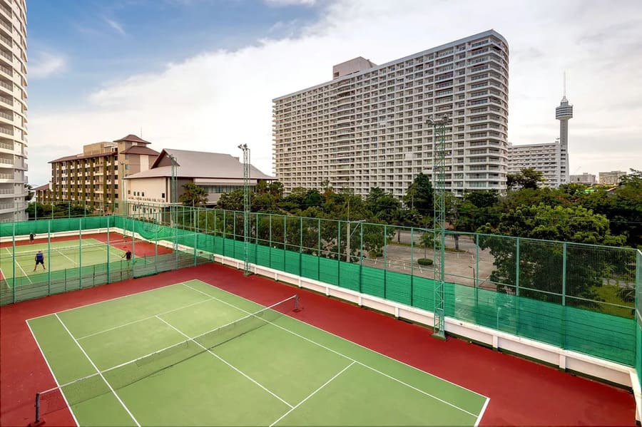 项目位于芭提雅中天,一楼有很多商铺,有便利店、餐馆、酒吧等,配套 2 片网球场。距离中天海滩 200 米,距离移民局 800 米。出小区就有 7-11 便利店和各类店铺。
