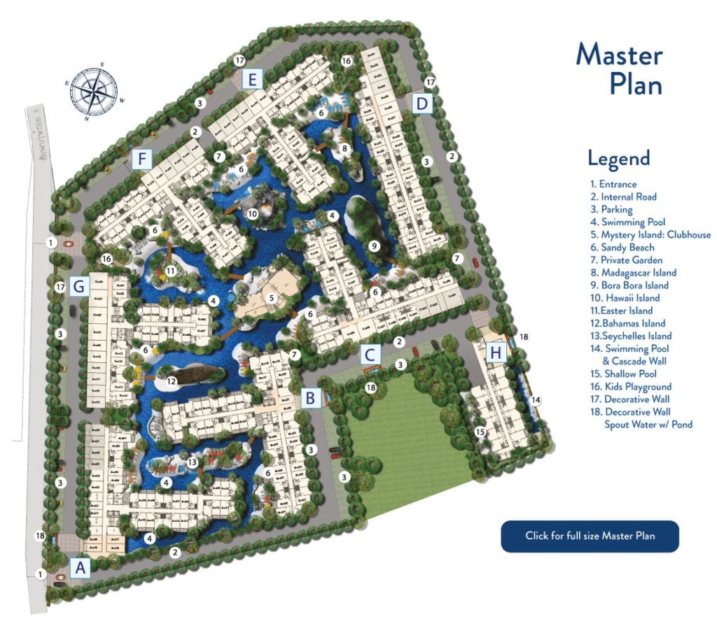 The project consists of 7 buildings by simulating the names of different islands: Easter Island, Mystery Island, Madagascar, Bahamas, Bora Bora, Seychelles, and Hawaii. It is surrounded by tropical gardens and a giant lagoon swimming pool. The common area is adorned with pirate ships, moai statues, and seating areas to gain the sunshine. The rooms are fully furnished and come with a large balcony and a European kitchen, equipped with a Smart Home system that offers great convenience and 24-hour security systems.