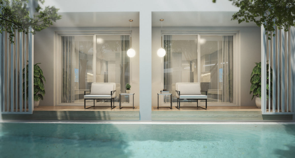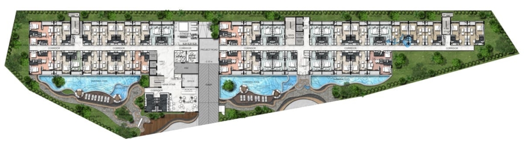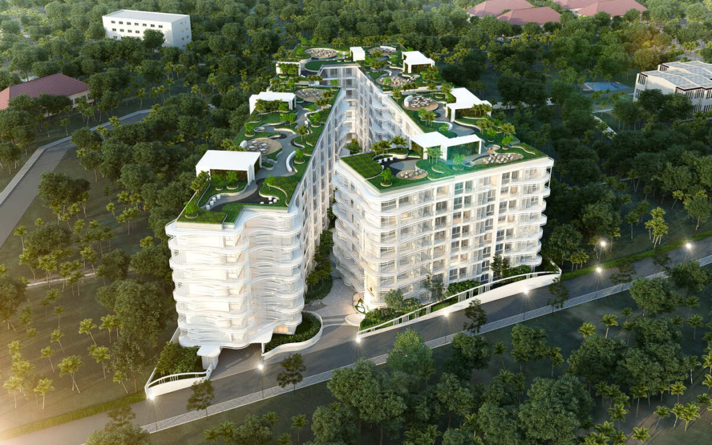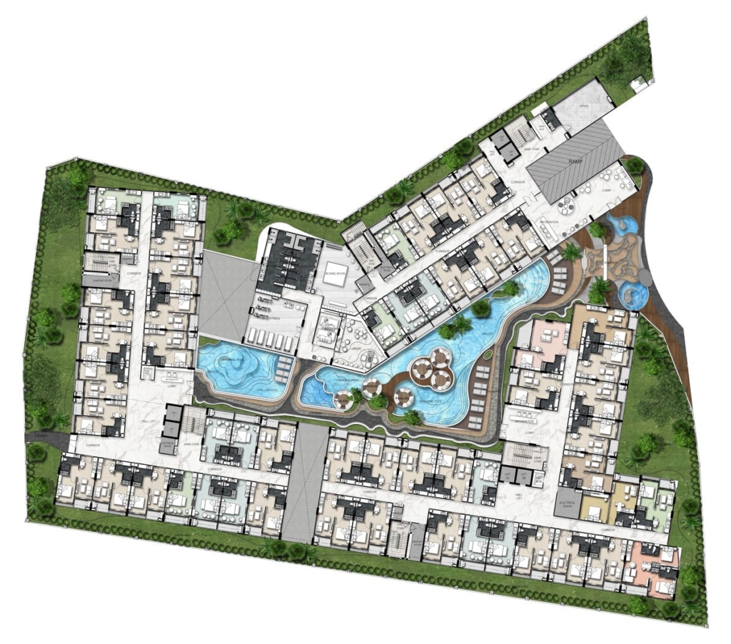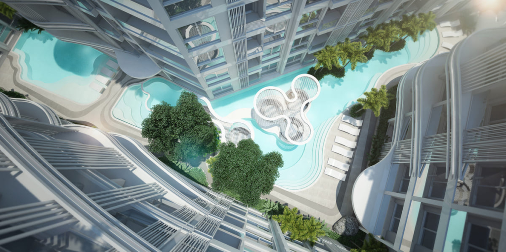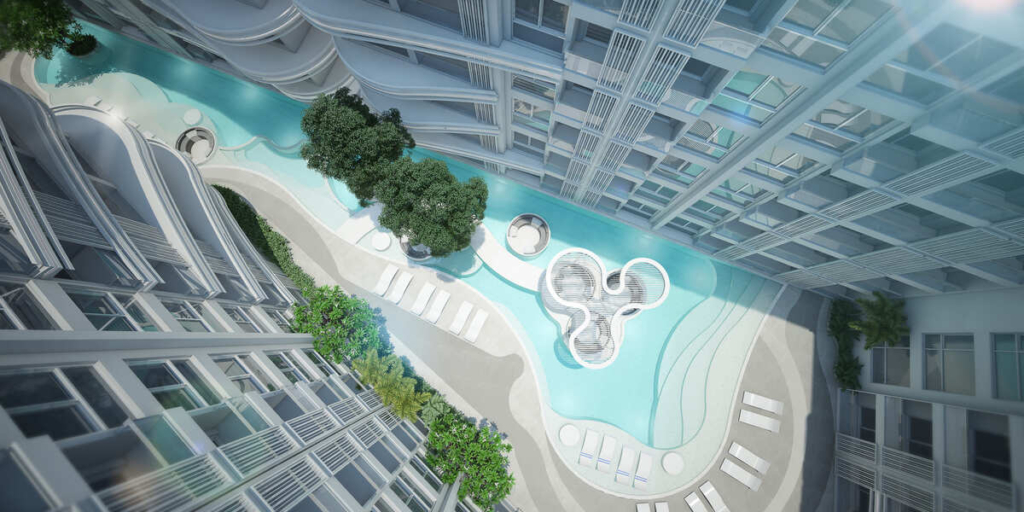 项目的核心是宽敞的珊瑚风格游泳池,配有最先进的盐处理溢流系统,住户将享受一系列公共设施,包括 24 小时保安巡逻、儿童游乐区、电影院、健身房、按摩浴缸、图书馆、桑拿浴室和 Wi-Fi 连接。