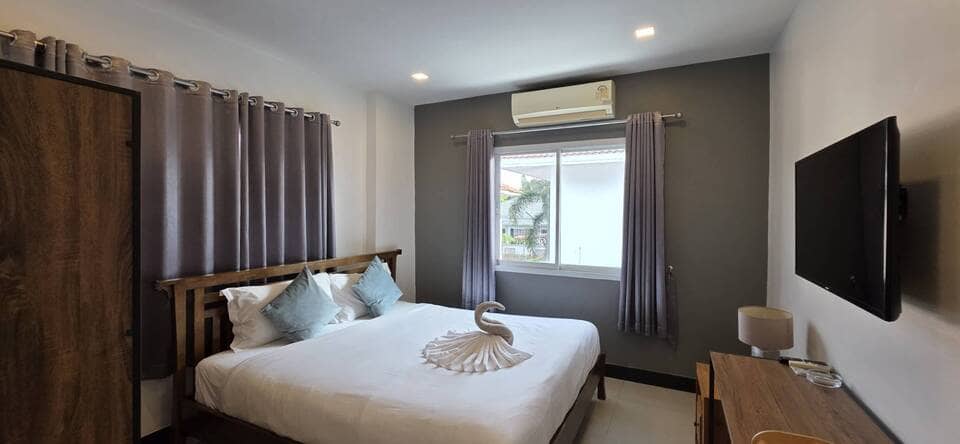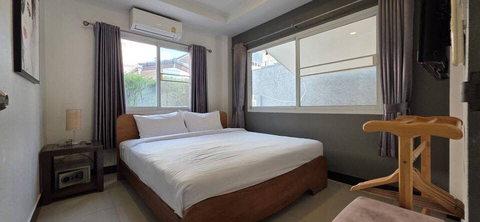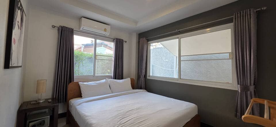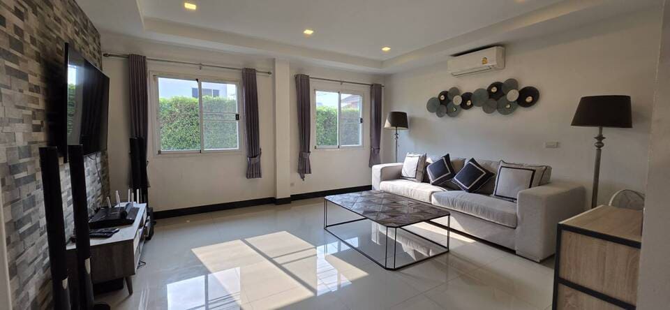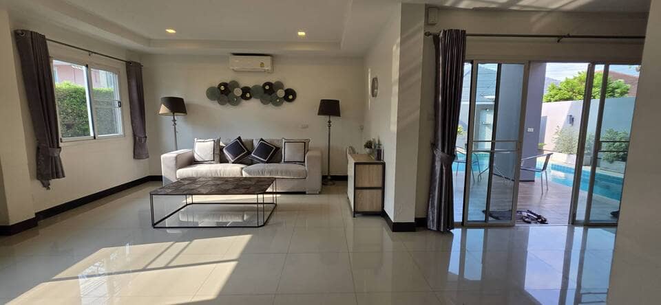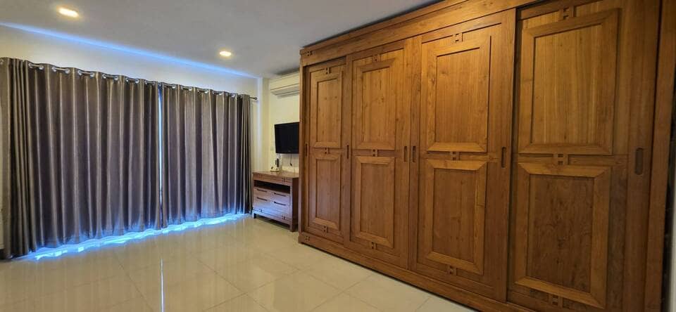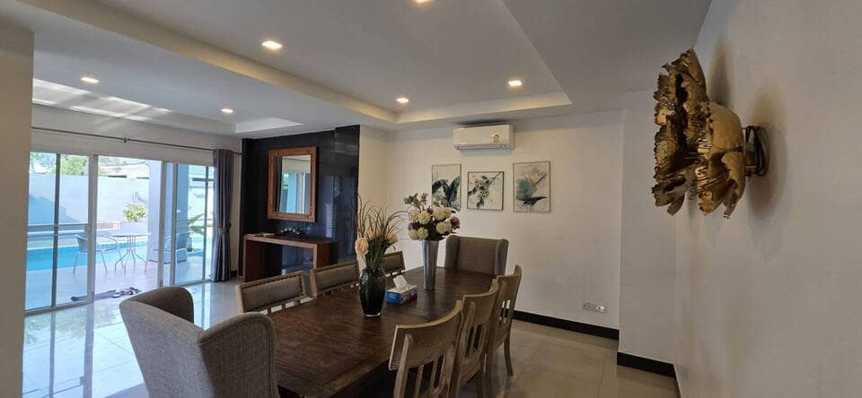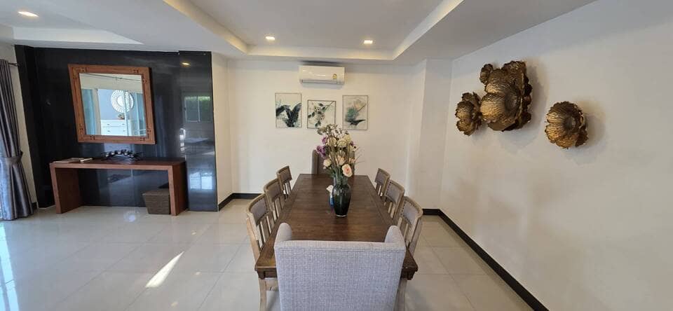 This villa is located in View Point Village, Chaiyaphruek area, Jomtien, Pattaya. It is a detached two-storey private pool residence. The property is approximately 350 meters from Sukhumvit Road, providing convenient access. Jomtien Beach and the Local Fishing Market Jomtien are about 1.1 kilometers away. Nearby amenities include the Floating Market, Jomtien Hospital, and Lotus’s hypermarket, making daily shopping and transportation convenient.
