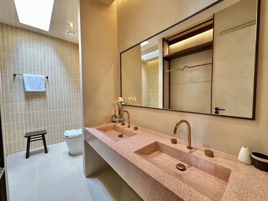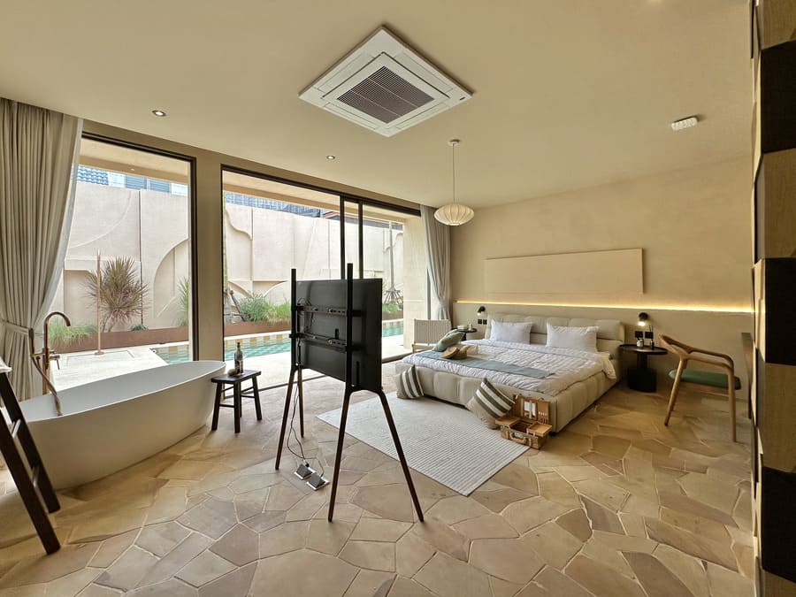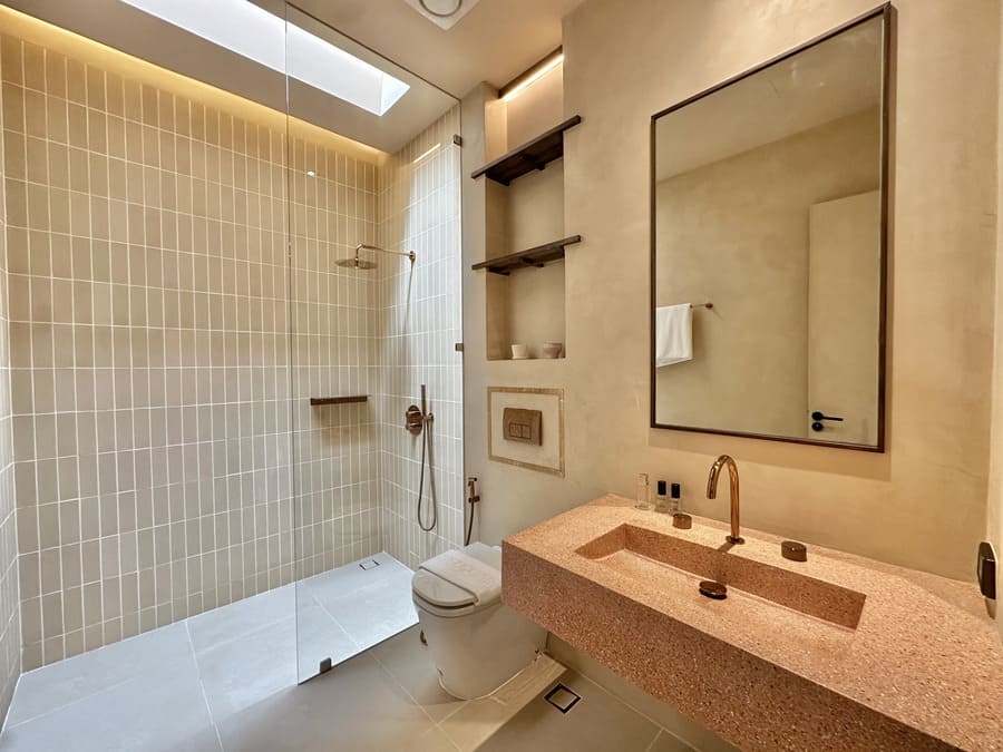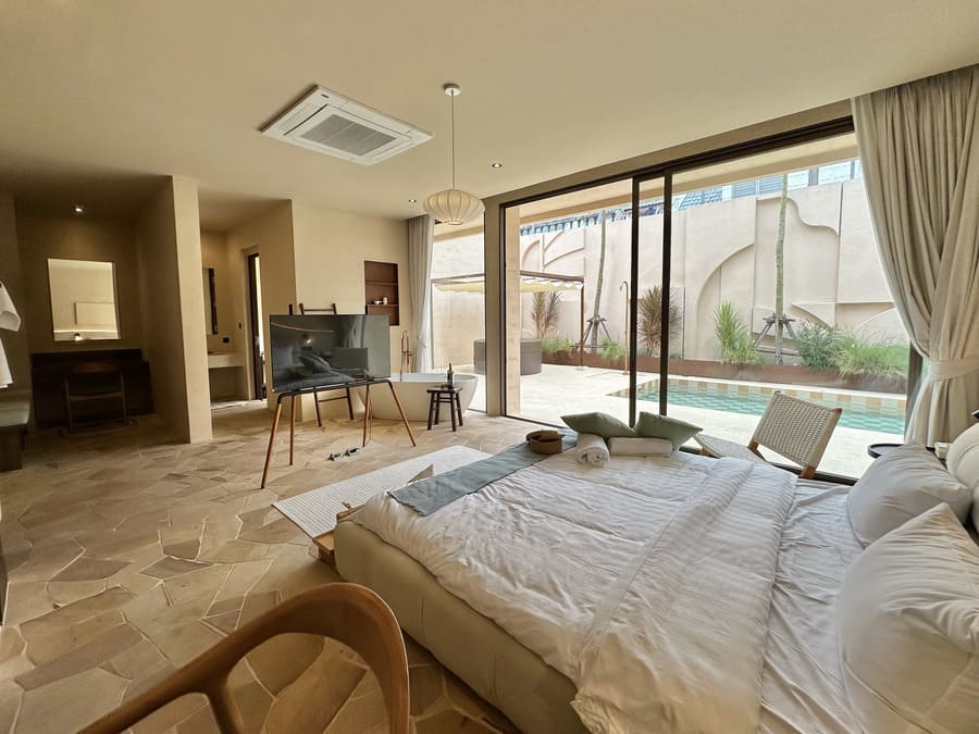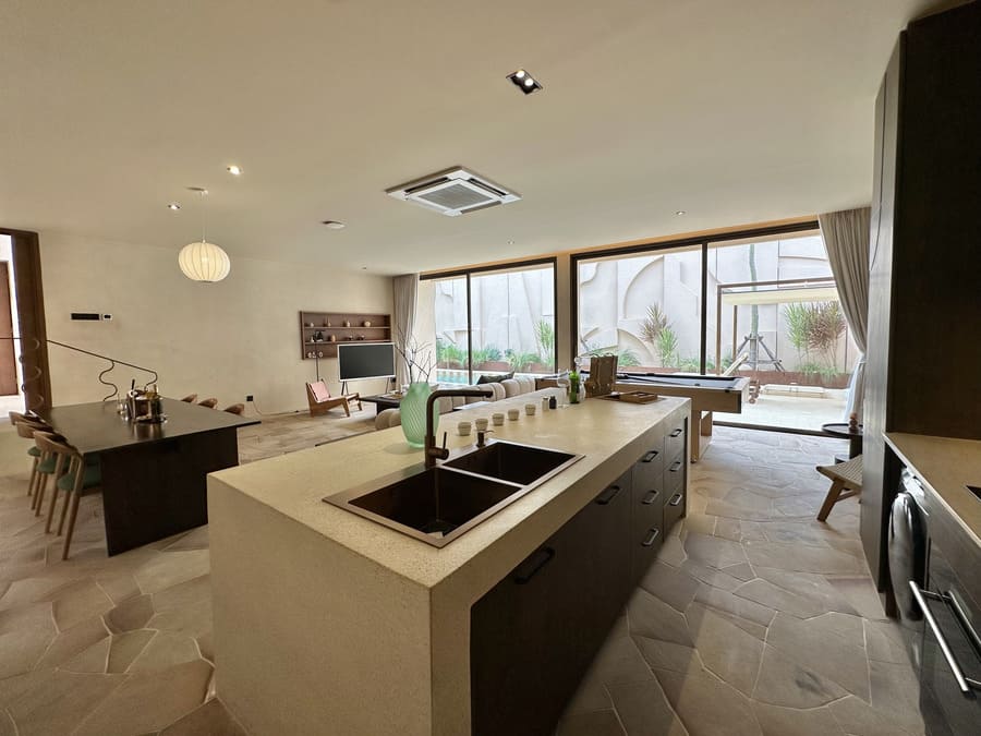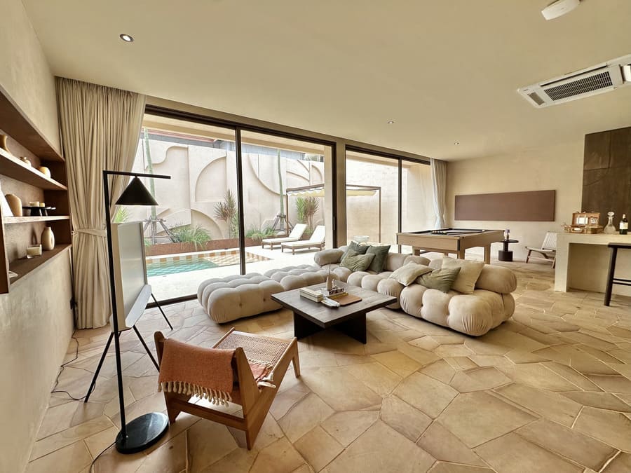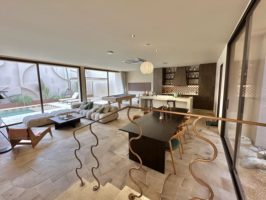 Villa Barrera is a private villa situated on approximately 544 square meters of land, built in a modern Moroccan architectural style with a two-story layout and around 450 square meters of interior living space. The villa features high surrounding walls that provide exceptional privacy while creating a distinctive resort-like atmosphere. The central swimming pool serves as the visual core of the courtyard, complemented by expansive floor-to-ceiling windows that bring natural light and water reflections indoors, forming a serene and sophisticated living ambience. The villa includes five bedrooms and six bathrooms, with an open-plan living room and island kitchen designed for family living, vacations, or hosting guests. The outdoor area offers a Jacuzzi, relaxation spaces, and landscaped gardens, contributing to a tranquil resort-like environment. Parking for up to six cars is available, an exceptionally rare advantage for city-located villas.