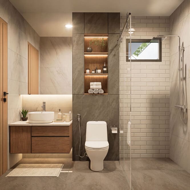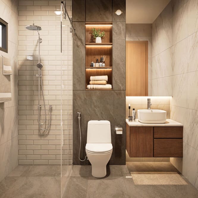 整个浴室均铺有瓷砖,设施齐全,包括所有卫生洁具、淋浴、淋浴玻璃、橱柜等。